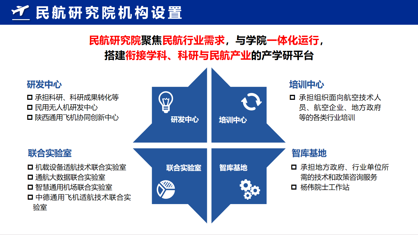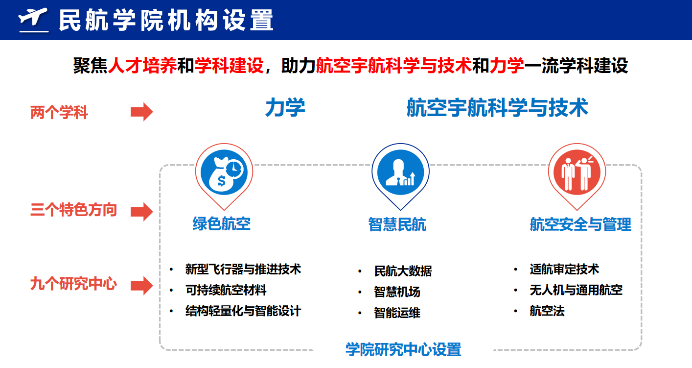 太阳成tyc33455cc官网聚焦人才培养和学科建设,与研究院一体化运行,以绿色航空、智慧民航、航空安全与管理三大特色方向为引领,着重打造九大研究中心,助力航空宇航科学与技术和力学学科建设。民航研究院聚焦民航行业需求,与学院一体化运行,搭建衔接学科、科研与民航产业的产学研平台。