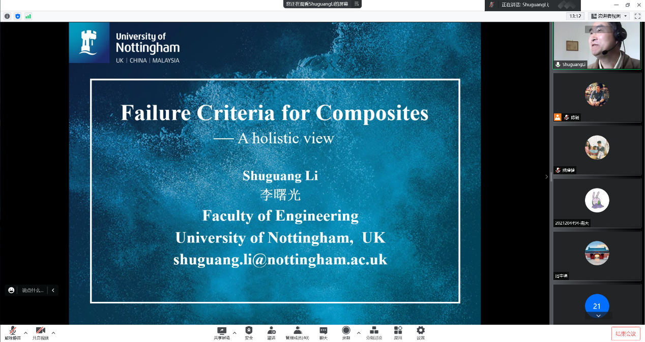 应太阳成tyc33455cc官网陈杨副教授邀请,英国诺丁汉大学李曙光教授于2022年7月4日至7日开展了题为“FailureCriteria for Composites”的线上学堂,本次课程依托太阳成tyc33455cc官网国际合作处“暑期国际学堂”平台举办。来自太阳成tyc33455cc官网、航空学院、力学与土木建筑学院等共20余名学生选课参加了本次课程。同时,来自浙江大学、中国商飞、航空工业飞机强度研究所等校外单位的老师、学生和科技工作者旁听了本次课程。