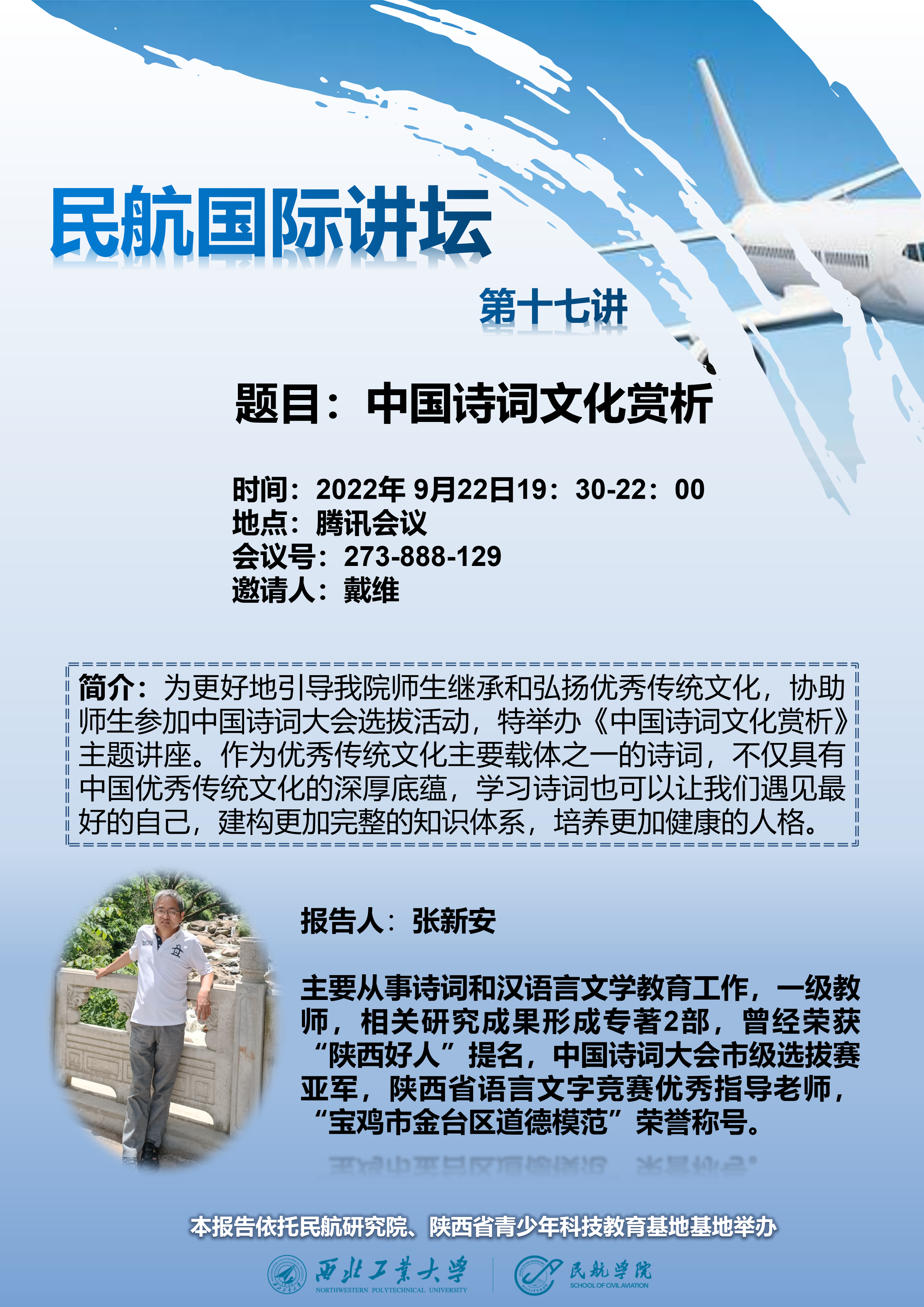 9月22日晚七点三十分,太阳成官网拟线上举办“中国诗词文化赏析”专题讲座,届时欢迎各位老师同学参会交流。讲座信息如下: