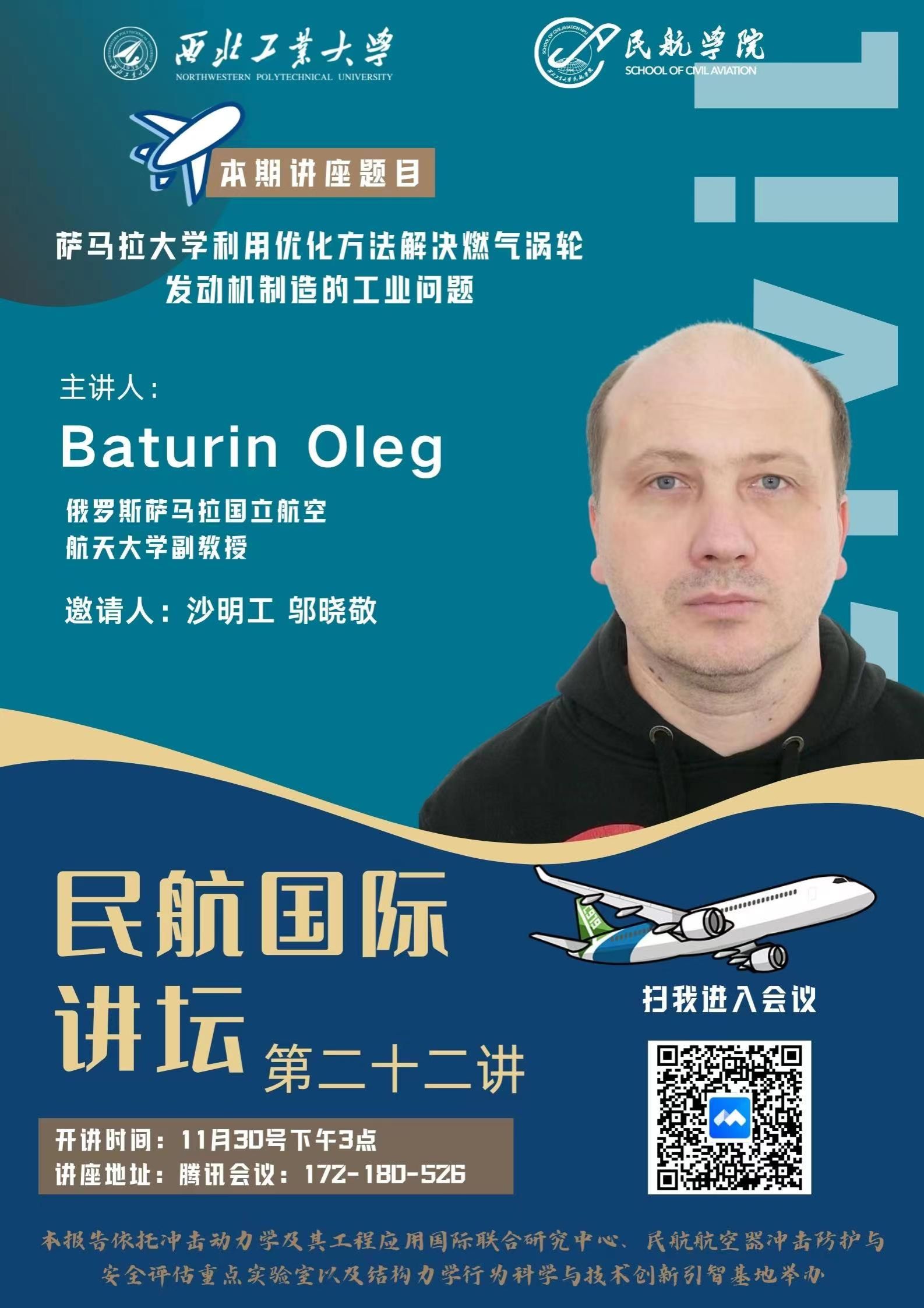 Baturin Oleg - 2001年获得萨马拉国立航空航天大学,飞机发动机系,飞机发动机和动力装置专家学位,2006年获得萨马拉国立航空航天大学,飞机发动机理论系,热、电火箭发动机和飞机动力装置专业博士学位。现任萨马拉大学飞行器发动机理论教研室与动力装置学院副教授,航空发动机理论系科教部高级研究员。2001-2006年曾兼职俄罗斯萨马拉JSC KUZNETSOV涡轮机和强度部工程设计师。2016-2017年曾任南京航空航天大学客座教授。