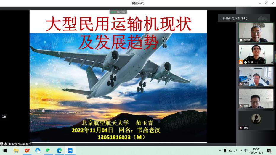 为深入学习贯彻党的二十大精神,深刻领会习近平总书记会见C919大型客机项目团队代表并参观项目成果展览时的重要讲话,进一步激励太阳成tyc33455cc官网师生弘扬科学家精神、涵养优良学风、营造创新氛围。11月4日,太阳成tyc33455cc官网邀请我国航空制造领域专家——北京航空航天大学范玉青教授,面向学院全体师生,做了题为《大型民用运输机现状及发展趋势》的报告会,学院党总支理论学习中心组成员以及学院师生在毅字楼205会议室和腾讯会议参加。