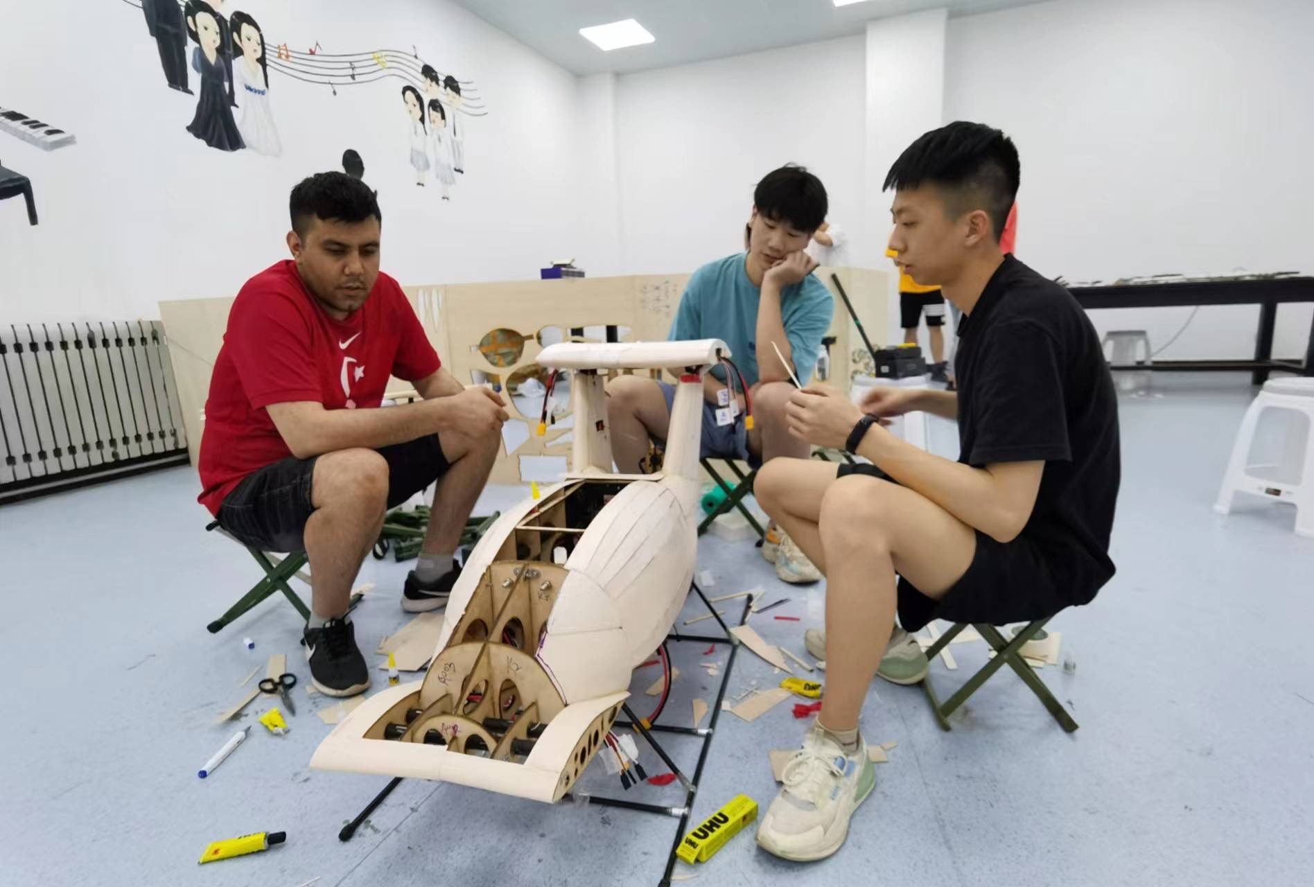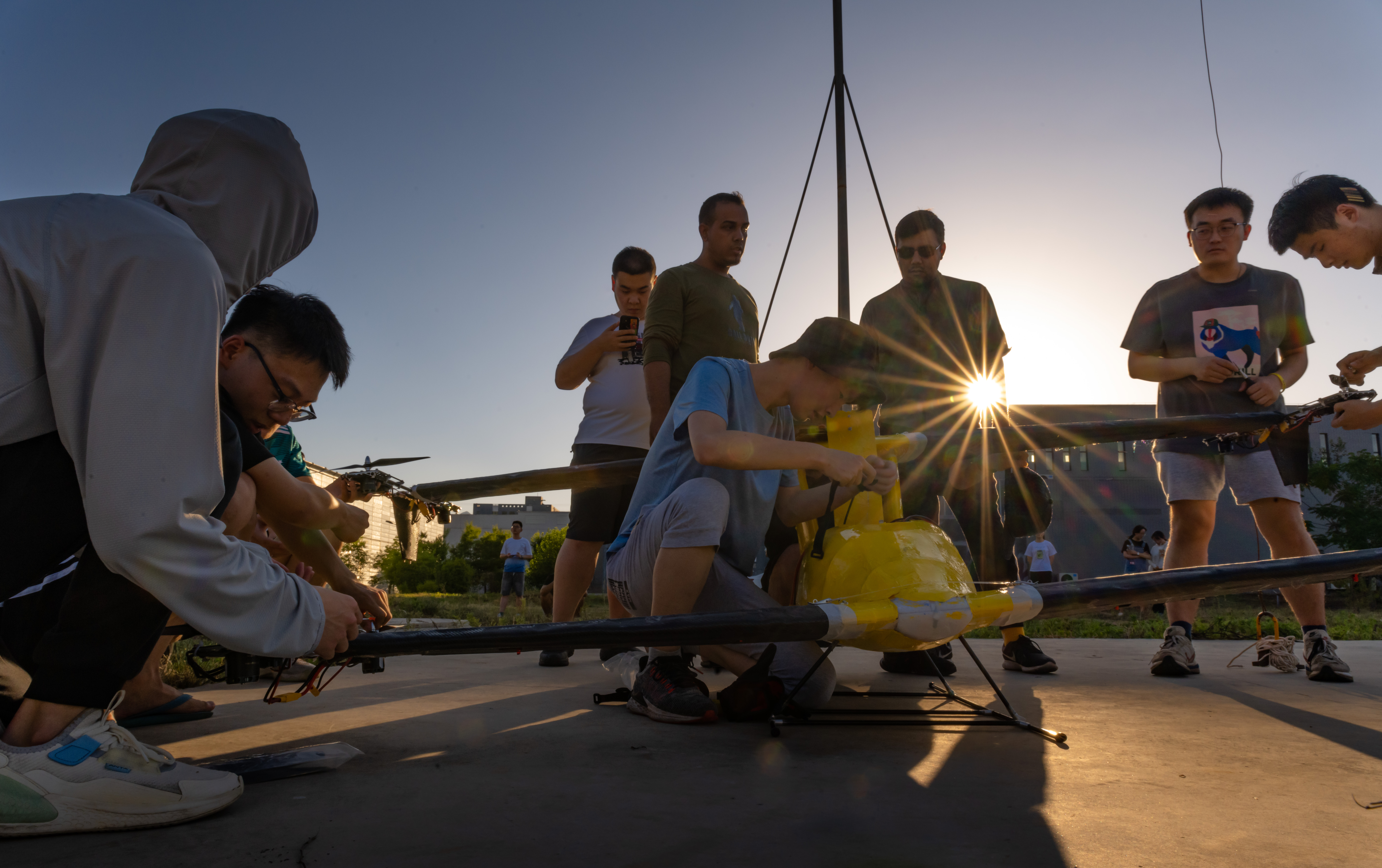 六月一个傍晚,那天的夕阳格外波澜,金光闪烁,照在操场上几位青年人的脸庞上,他们正聚精会神的围绕着初见雏形的e-VTOL飞行器做第一次调试,间或就各自想法进行低声交谈,此情此景下的一切显得格外恰如其分...