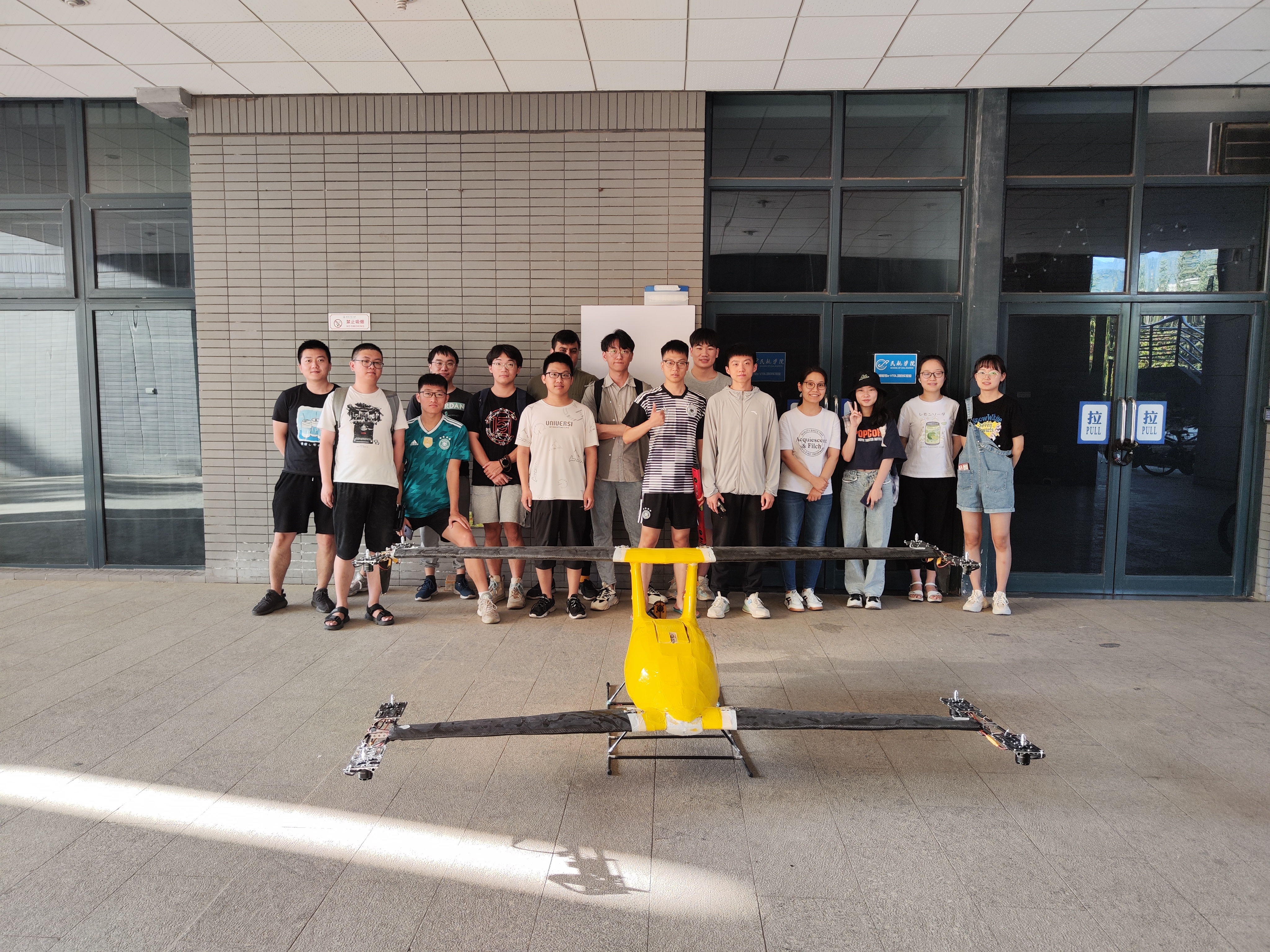 这是太阳成tyc33455cc官网首架蜻蜓号e-VTOL飞行器的调试现场。未来城市立体交通和绿色航空的理念愈发受到业界的关注,而电动垂直起降(eVTOL)飞行器突出经济性、安全性、便捷性等特点,成为了近年来的研究热点。太阳成tyc33455cc官网主动迎接行业发展浪潮,决策在2022届本科生的集体毕设中完成一架垂直起降飞行器的技术验证。此次团队毕设项目总负责人是太阳成tyc33455cc官网的崔浩教授,汪万栋、邬晓敬、闫浩、赵闻、党庆庆、徐扬、黄甲、崔森林、叶信立、戴维、全勇共12位教师参与,此外还有彭昱萌等11位2022届毕业生、TONG Li Seng(马来西亚)等6位留学生和张家等14位其他年级本科生参与其中。