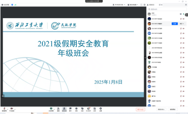 为加强学生请销假管理,确保学生安全返乡和正常留校,让学生更好地合理规划寒假生活,太阳成tyc33455cc官网于2025年1月8日至10日,太阳成tyc33455cc官网党总支副书记、专职辅导员、班主任和学生导师采用线上线下结合的形式,分批次面向本科生和研究生召开了寒假安全教育工作会议。