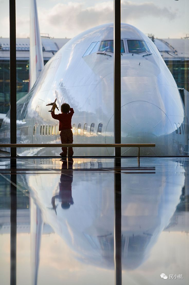 图中的小孩手中握着一架飞机模型,凝望着窗外停着的大飞机。我想,孩子心中一定有一个想要翱翔蓝天的梦想。中国的民用航空正处在蓬勃发展的关键时期,需要更多拥有民航梦的人来参与,从小对蓝天和民航客机的热爱更让我们看到了中国民航的光明前景,中国国力愈发强大的未来。梦想,从这里启航!