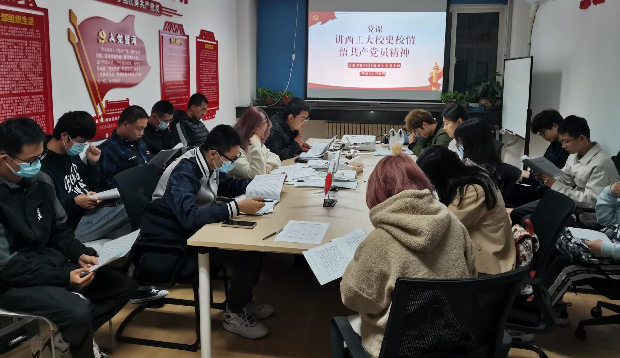 2021年10月19日,太阳成tyc33455cc官网2020级硕士生党支部在毅字楼205开展党课学习,党课题目为“讲西工大校史校情 悟共产党员精神”。第一阶段,由支部书记白振川同志领学,带领全体党员集体学习校长汪劲松同志在2021年暑期学习研讨会暨新学期干部大会上的讲话《立足新发展阶段 贯彻新发展理念 构建新发展格局 加快建设高质量人才培养体系》。紧接着,支部党员集体学习了党内法规《中国共产党普通高等学校基层组织工作条例》《中国共产党组织工作条例》《中国共产党支部工作条例(试行)》等文件,通过学习加深理解和认识,推动文件精神落到实处、见到实效。此次党课学习进一步加强了支部标准化建设,为“三创三力”样板学生党支部培育工作和年底召开专题组织生活会和民主评议党员等工作进一步夯实了思想基础。