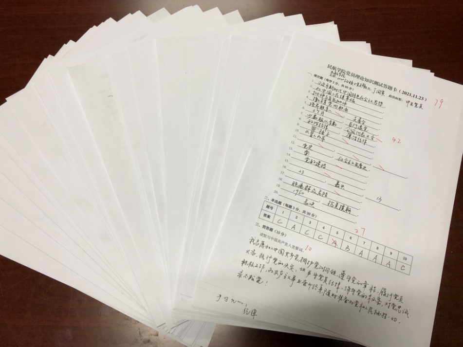 为确保考试效果,本次考试采取AB卷、闭卷考试,由专职辅导员全程监考。考试题目包括填空、选择、简答等,内容涵盖党章党规、“四史”特别是党史党情、习近平总书记近期部分重要讲话、党的十九届六中全会精神及学校近期重要会议和重大决策等,着重考察学生党员和入党积极分子开展理论学习的内容覆盖面及学习效果。