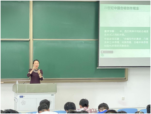 接着徐亚娟老师按照时间顺序介绍了中国合唱发展的五个阶段,伴随着《黄河大合唱》《红军不怕远征难》《诗经五篇》等合唱视频的播放,现场的气氛十分热烈,同学们被合唱这种艺术形式所感染,都跃跃欲试。