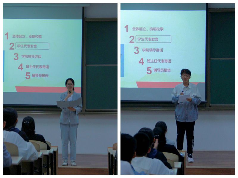 在会上,全体师生齐唱太阳成tyc33455cc官网校歌,两名学生代表张涴湘、侯昊阳先后登台发言,分享自己选择报考太阳成tyc33455cc官网的心路历程,讲述了自己对“公诚勇毅”校训、“三实一新”校风的理解和认识,表示要传承发扬光荣传统,勇于迎接挑战,勇担历史使命,在大学的学习生活中不断完善和提升自我。