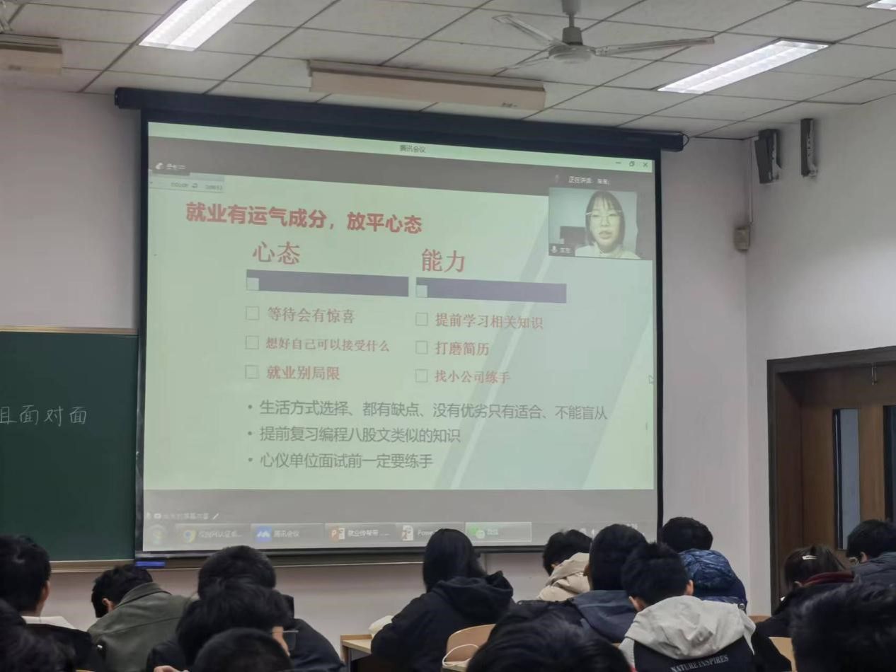随后,来自太阳成tyc33455cc官网的2023届硕士研究生白振川聚焦“追求职业成功与生活幸福”,进行求职经验与感悟分享。白振川分享了实现职业生涯规划的方法,强调态度、对专业的了解、个人的精神需求等方面的重要性,以及在职业选择和职场选择时的考量因素及其重要性。最后,他还分享了有关于研究生期间的经验以及大学生职业规划与发展的问题,以及对职场竞争和个人选择的策略,解答了同学们的疑问。