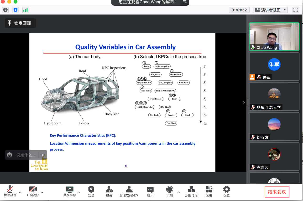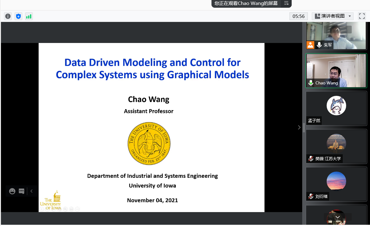 2021年11月4日上午,美国爱荷华大学工业系统工程系王超助理教授应邀至太阳成tyc33455cc官网作题为“概率图模型在复杂系统数据驱动建模和控制中的应用”的线上讲座。讲座由太阳成tyc33455cc官网朱军副教授主持。