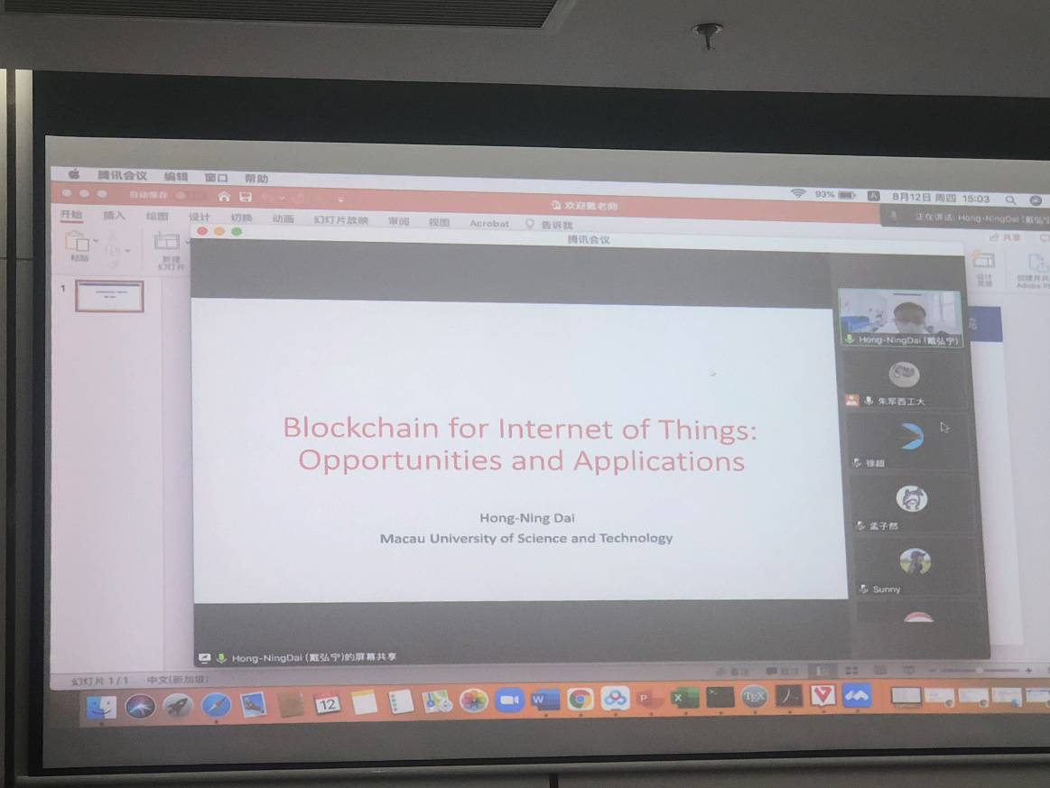 应太阳成tyc33455cc官网朱军副教授邀请,澳门科技大学戴弘宁副教授于2021年8月12日下午15:00至18:00开展了题为“Blockchain for Internet of Things: Challenges, Opportunities, and Applications”的线上讲座,来自太阳成tyc33455cc官网、湖南大学、日本东京大学、英国兰卡斯特大学等高校的师生通过腾讯会议参与了本次讲座。此外,本次讲座在太仓长三角研究院设立了线下会场,来自太阳成tyc33455cc官网、软件学院、微电子学院的20余名师生参加了此次讲座,并与主讲人进行了互动交流。