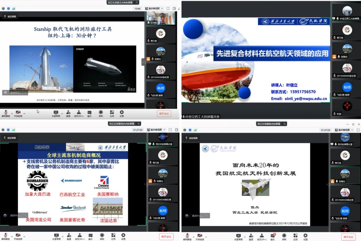 讲座开场,张晓化副院长分别介绍了四位老师,并对他们的出席表示感谢,随后向同学们介绍了学院开展此次本科生系列讲座活动的意义,并鼓励所有年级的本科生积极参加。首先,王光秋教授主要介绍了现代民航产业的基本特点和技术发展趋势。重点介绍了现代民用航空发动机的产品和新技术,也讨论了航空发动机未来市场需求和技术发展趋势。接着,叶信立副教授分别从复合材料的定义及结构、复合材料的应用趋势、复合材料在航空领域的应用、复合材料在航天领域的应用四个方面进行了专业介绍,并与学生们进行了充分的互动。党庆庆助理教授的讲座深入浅出、案例生动、丰富,简单,主要介绍了大型飞机的分类以及大型民用与军用飞机的发展;结合历史上著名客机的失败案例,讨论了一款成功的客机需要具备哪些要素;介绍了波音和空客的发展历程以及给我国大型客机发展的启示。陈杰副教授围绕航空航天领域两位院士的最新公开报告内容,结合未来航空领域的发展趋势进行了科普性的讲座,并鼓励学生积极参加学院举办的“民航号”电动垂直起降飞行器设计竞赛。